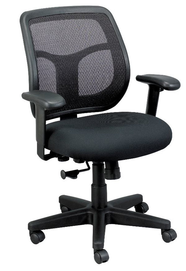 The Apollo High-Back with Ratchet Back Task Chair by EuroTech is a perennial favorite, combining value, comfort, adjustability and quality, and featuring a breathable, color-coordinated mesh back that matches the comfortably contoured and padded waterfall seat. Other features include tilt tension control, tilt lock, synchronous-tilt, width and height adjustable arms, and 2.8" of back height adjustment. The chair is offered in a black mesh back and black mesh topped high density foam seat.