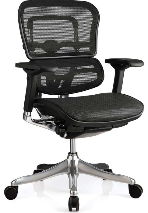 Premium mesh seat and back. Polished aluminum base and heavy duty casters. Cleaner seat under-body. Single toggle control for functions. The Ergo Elite is 97% post-use recyclable.