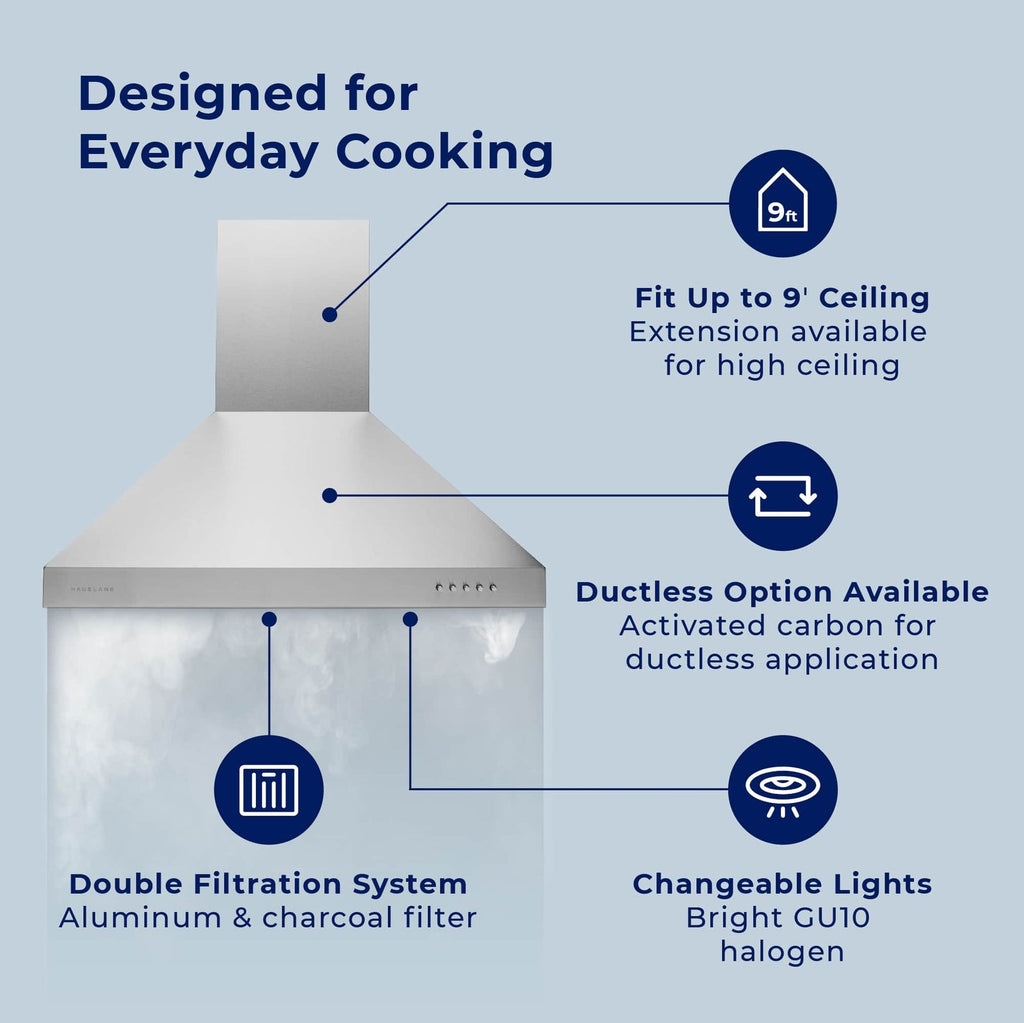 Hauslane | Chef Series WM-530 30” Wall Mount Range hood | Base Model | Stainless Steel Wall Chimney | Strong Suction, Six-layer Aluminum Filters, Changeable LED Lamps, 6” Duct or Ductless