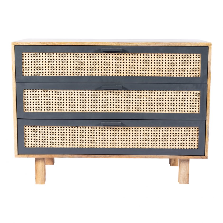 A stylish combination of solid mango wood and woven cane gives the Ashton Chest a fresh contemporary style. Three spacious, dark-framed drawers maximizes storage options for smaller bedrooms. The metal drawer glides allow for easy access and durability.