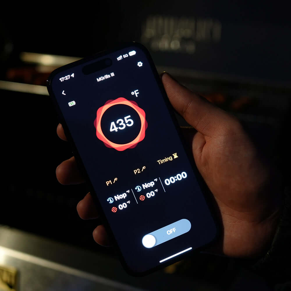 Bluetooth app for temperature readings, alerts, and timer settings.