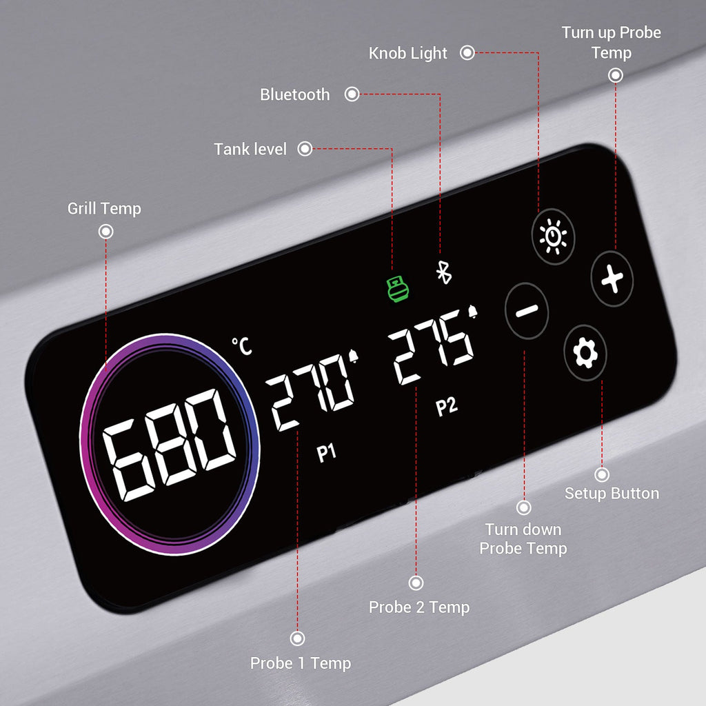 3rd-generation LED touch panel: easily monitor temperature, timer, lighting modes, gas tank capacity, and more. Daytime clear.