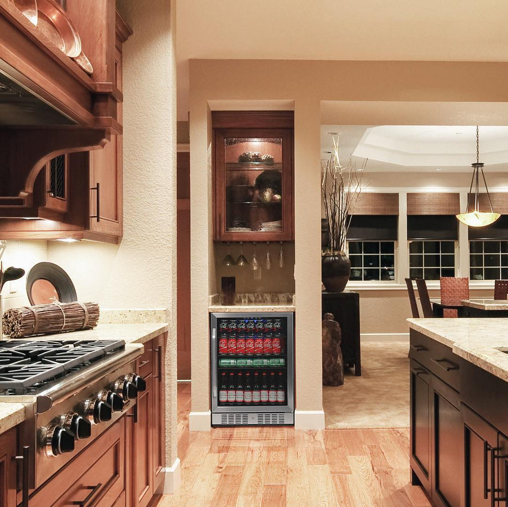 The quiet, front-venting compressor system allows this beverage fridge to fit snugly under standard kitchen counters. Just slide it into place for a sleek, integrated look that blends perfectly with your cabinetry — or let it stand alone. The choice is yours.