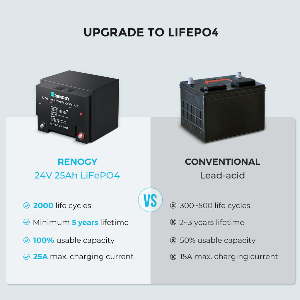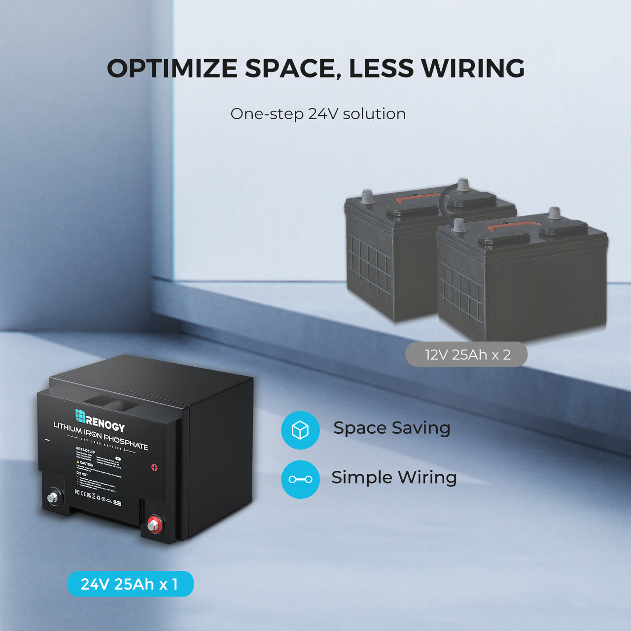 【Easy Upgrades】A space-saving choice for your 24V power system. Upgrades from lead-acid to lithium seamlessly with a greater energy density, 100% usable capacity, and a faster-charging speed.