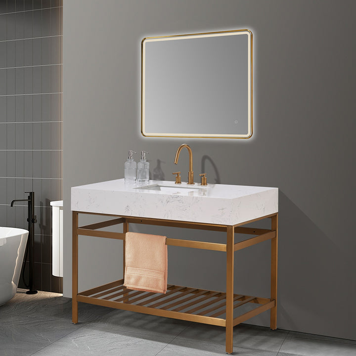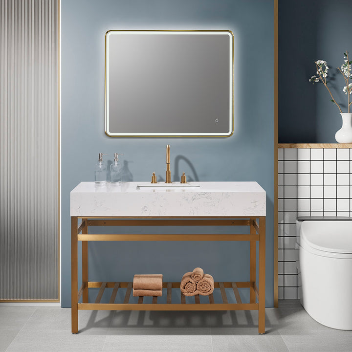 - Single, rectangular LED mirror with aluminum frame coordinates perfectly with vanity.