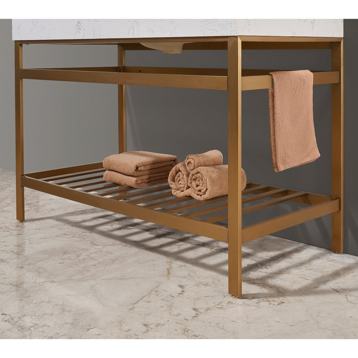 Looking for an elegant addition to your contemporary décor? Our Merano Stainless Steel Console Vanity blends the simple aesthetic of a pedestal sink with the sturdiness of a wall-mounted model. With flawless clean lines, it features a stylishly thick countertop crafted of premium composite stone with delicate veining. The open shelving below is the perfect place to stash plush towels and toiletries.