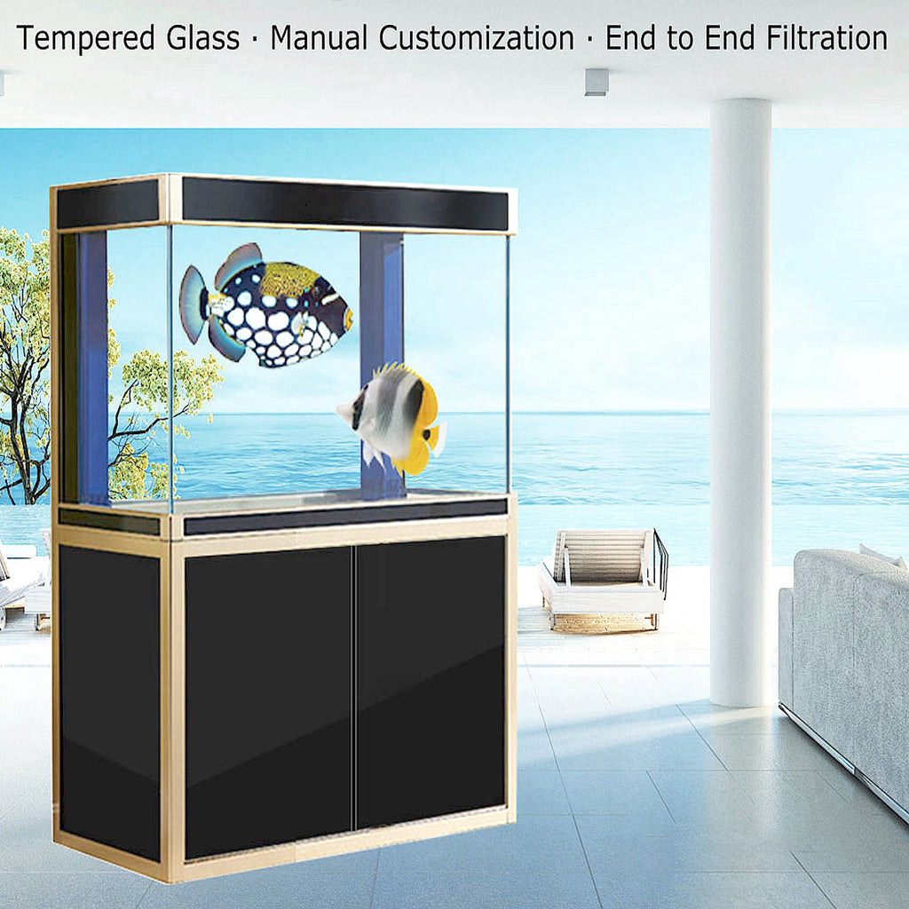 The fish tank is made of high-quality low-iron tempered ultra-white transparent glass ("crystal glass"), with a light transmittance of >91.5% for a clearer-looking tank that is more resistant to scratches and fingerprints. Robust ~0.315 inches thick glass paneling allows the tank to easily withstand the impact of everyday use as well as increase acid and alkali resilience. Each panel is bonded by a German high-endurance biophilic silica gel which can resist saltwater erosion for up to 20 years.