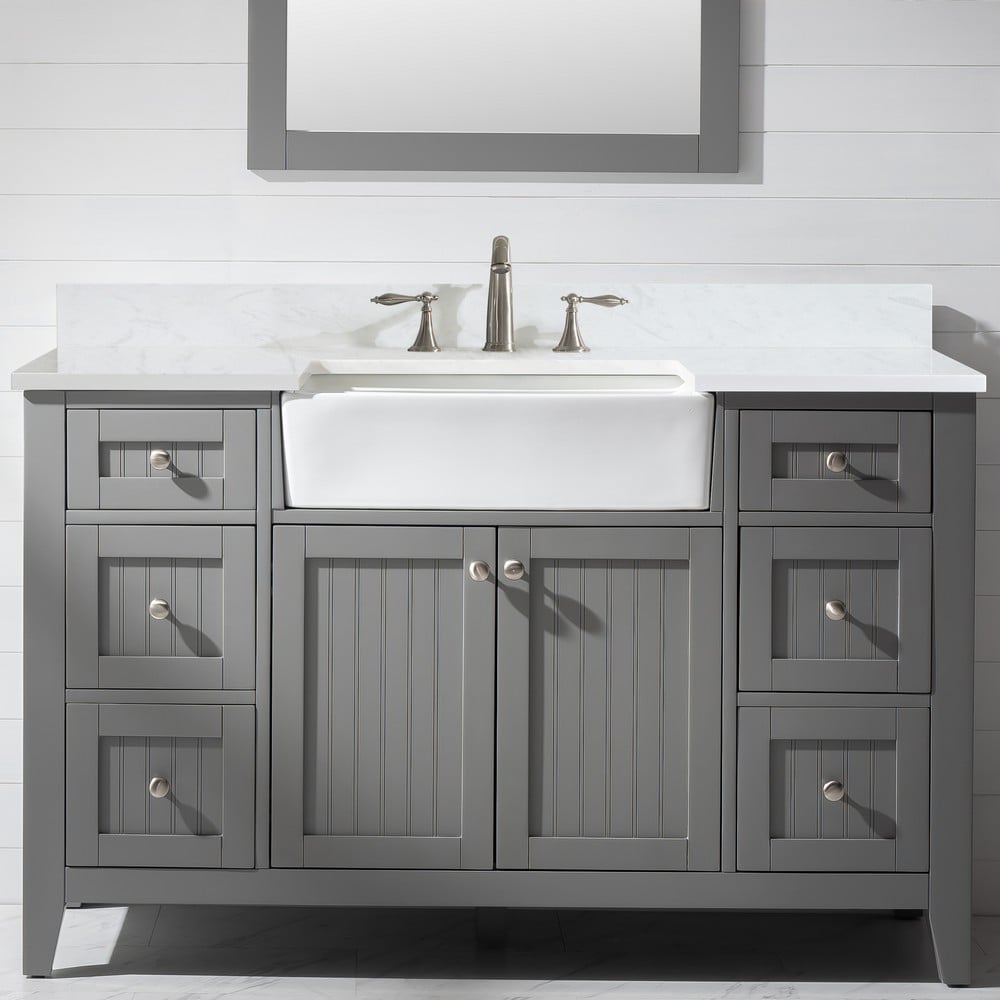 Combining classic farmhouse charms with modern features, the Burbank vanity collection by Design Element will instantly transform your bathroom into a beautiful retreat. All Burbank vanity cabinets are constructed from solid birch hardwood and paired with a 1 inch thick white quartz countertop and backsplash. The extremely functional and generously sized ceramic farmhouse sink is the focal point of this vanity. Soft closing doors and drawers provide smooth and quiet operations, while brushed finished metal hardware provides the perfect finishing touch. Other fine details include dovetail joint drawer construction, predrilled holes to accommodate 8-inch widespread faucets, and multi-layer paint finish on the cabinets provide beauty and durability for years to come.