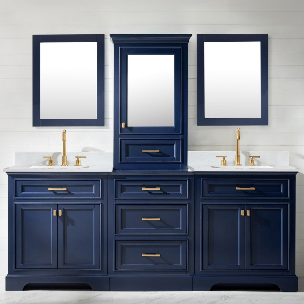 Combining classic charms with modern features, this elegant Milano modular combo vanity by Design Element will instantly transform your bathroom into a work of art. This unique modular vanity set is comprised of 2 single vanities, a draw unit, and a tower cabinet with an additional drawer and cabinet with a tempered glass door. All Milano vanity cabinets are constructed from solid birch hardwood and paired with a 1 inch thick white quartz countertop and backsplash. Soft closing doors and drawers provide smooth and quiet operations, while brushed finished metal hardware provides the perfect finishing touch. Other fine details include white porcelain sinks with overflow, dovetail joint drawer construction, predrilled holes to accommodate 8-inch widespread faucets, and multi-layer paint finish on the cabinets provide beauty and durability for years to come. Mirrors, faucets and drains are not included.