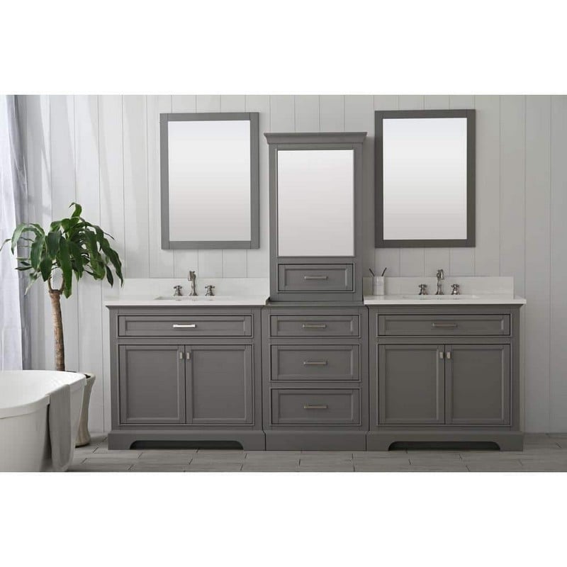 Combining classic charms with modern features, this elegant Milano modular combo vanity by Design Element will instantly transform your bathroom into a work of art. This unique modular vanity set is comprised of 2 single vanities, a draw unit, and a tower cabinet with an additional drawer and cabinet with a tempered glass door. All Milano vanity cabinets are constructed from solid birch hardwood and paired with a 1 Inch thick white quartz countertop and backsplash. Soft closing doors and drawers provide smooth and quiet operations, while brushed finished metal hardware provides the perfect finishing touch. Other fine details include white porcelain sinks with overflow, dovetail joint drawer construction, predrilled holes to accommodate 8-Inch widespread faucets, and multi-layer paint finish on the cabinets provide beauty and durability for years to come. Mirrors, faucets and drains are not included.