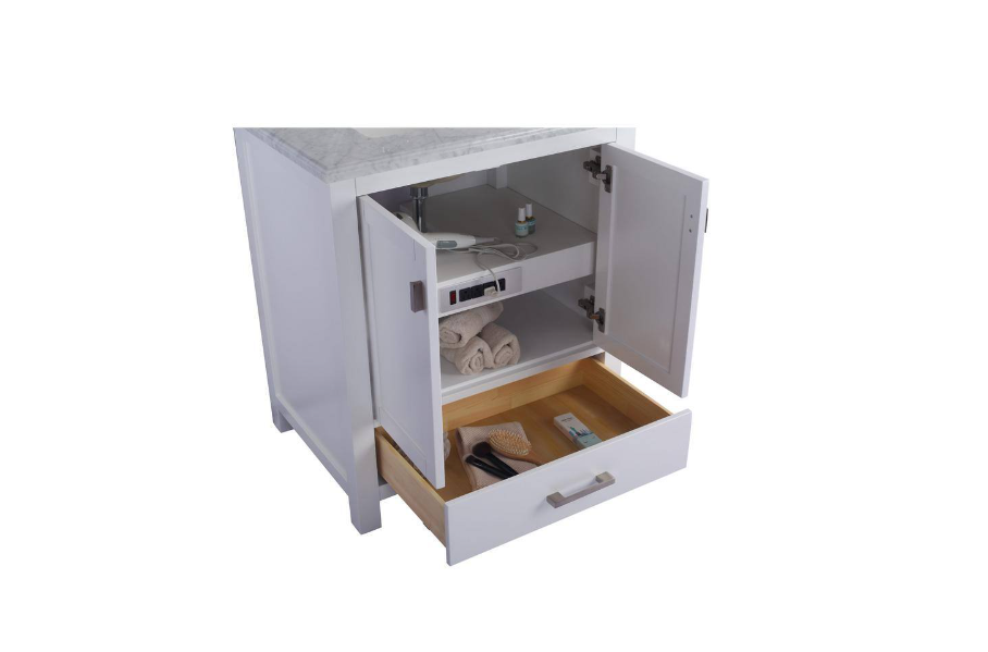 Style Transitional Vanity Features Concealed Shelves, Drawers, Fully Extendable Drawers, Soft Close Doors, Soft Close Drawers, With Electrical Outlet