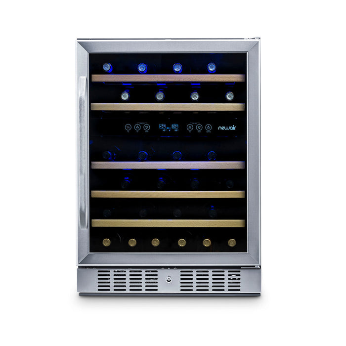 The roomy NewAir 24" Built-In Dual Zone 46 Bottle Wine Fridge slides easily between standard base cabinets to create the ultimate wine cellar in your custom kitchen. It can also stand alone anywhere you like. This fridge offers two cooling zones to keep 46 bottles of red and white wines at their ideal temperatures — and it looks great doing it, thanks to stainless steel and beech wood finishes.