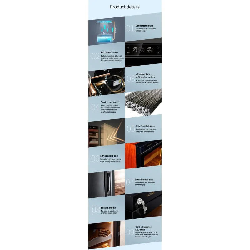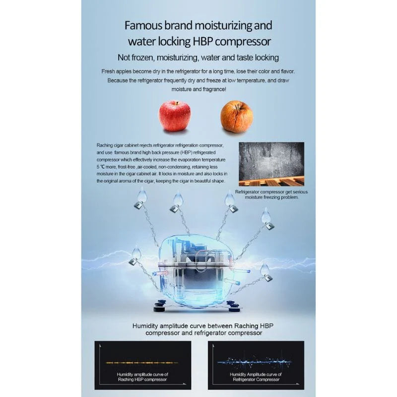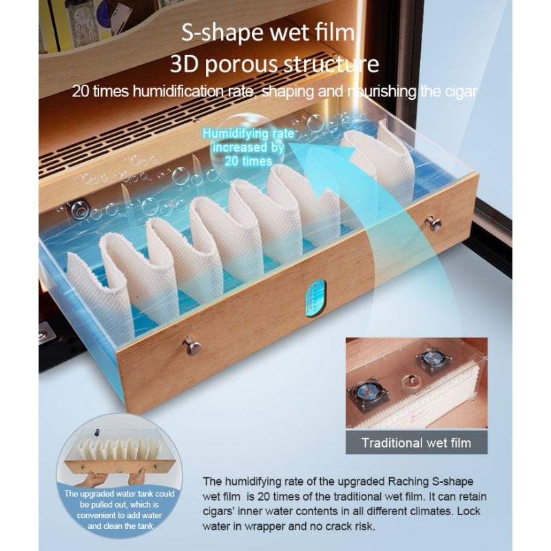As any cigar aficionado knows, the perfect humidor will keep your cigars fresh and ready to smoke at all times. That's why the Raching C380A humidor cabinet has an easy-to-use refrigerating system that eliminates frost and condensation while also boasting a honeycomb-shaped wet membrane for ideal humidity levels! This prevents moisture from evaporating as easily so your beloved stogies are protected in any climate condition.