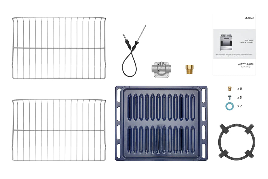 ROBAM’s dual fuel range made beautifully to fit in any kitchen. Make a statement in your kitchen with our full stainless steel body range while contracting in the background with blue interior oven. This dual fuel freestanding range features 5 sealed burners from 3,500 BTU to 18,000 BTU with continuous grates.