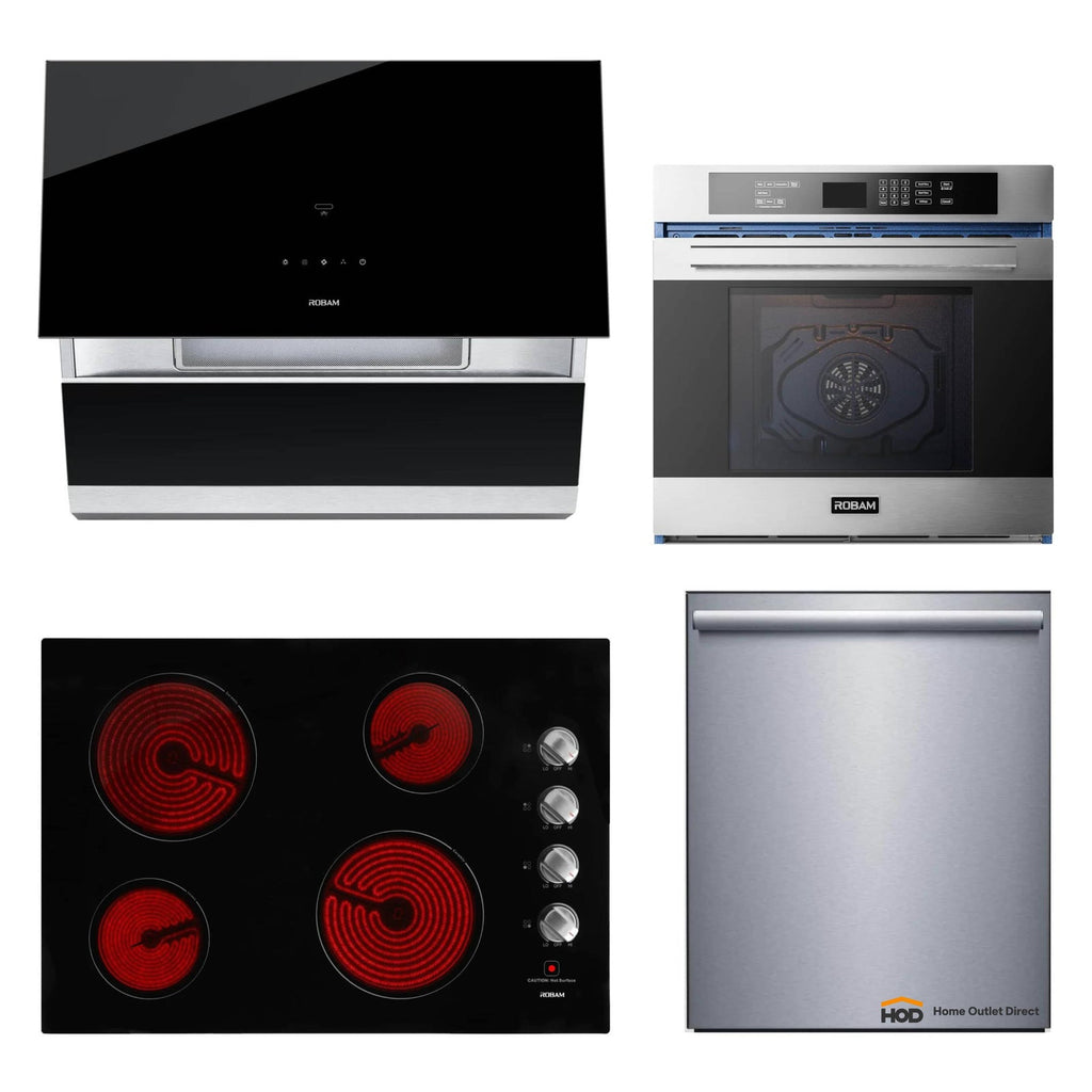 ROBAM 4-Piece Appliance Package - 30-Inch Radiant Electric Ceramic Glass Cooktop, Under Cabinet/Wall Mounted Range Hood, Dishwasher and Wall Oven in Stainless Steel  AP4-W412-A671