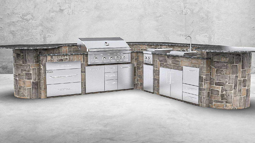 “This design was inspired by our President Zeke and his time spent in Las Vegas where he created many of these outdoor kitchens for customers in Nevada and California. The Venetian features 10'x10' double curved social bars and was inspired by the original Bellagio Design, just redesigned to encompass a much larger space. The selection of Sunstone Ruby Grills, bar centers, warming drawer,s and other designer components that work together in perfect harmony. Customers love this design for its unique features and functionalities.”
