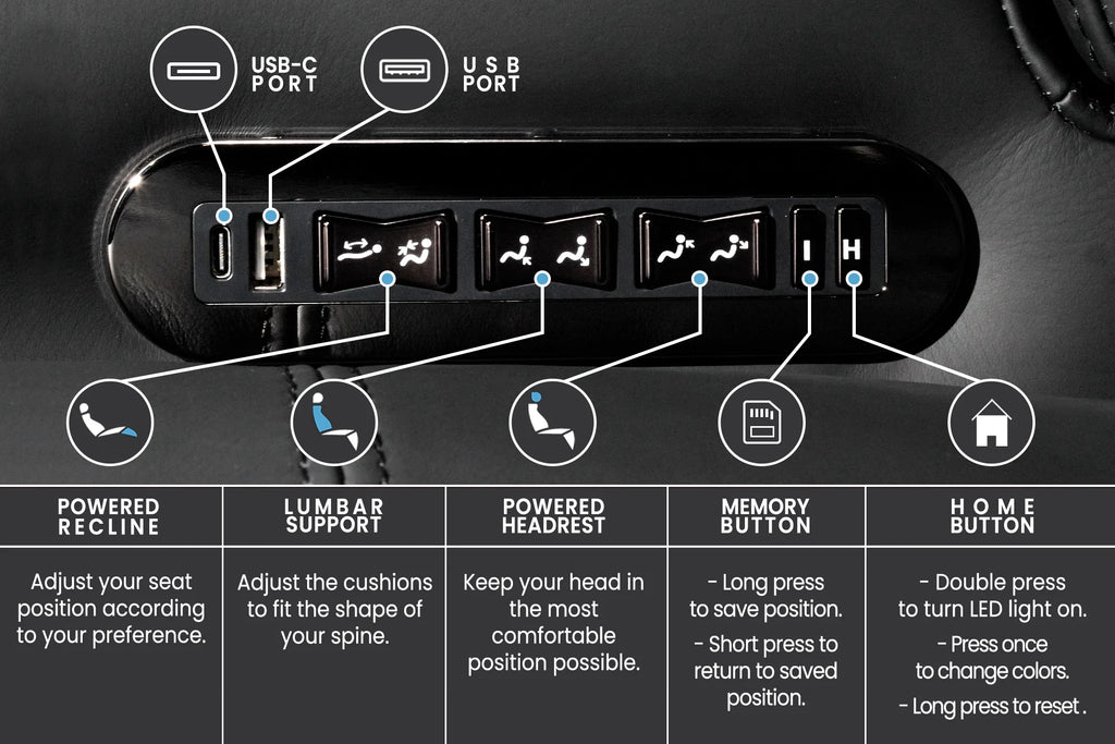 Navigate your comfort using the mechanical controls on the inside of the armrest. The control has a USB-C and regular USB port so you can charge all your devices while enjoying the movie. It is equipped with memory function to conveniently save your personal position preference as well as home button.
