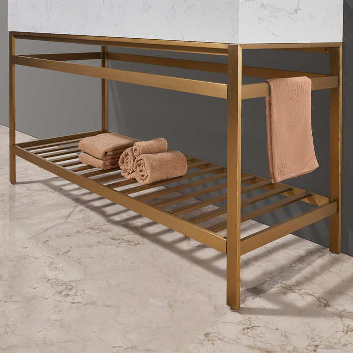 Looking for an elegant addition to your contemporary décor? Our Merano Stainless Steel Console Vanity blends the simple aesthetic of a pedestal sink with the sturdiness of a wall-mounted model. With flawless clean lines, it features a stylishly thick countertop crafted of premium composite stone with delicate veining. The open shelving below is the perfect place to stash plush towels and toiletries.