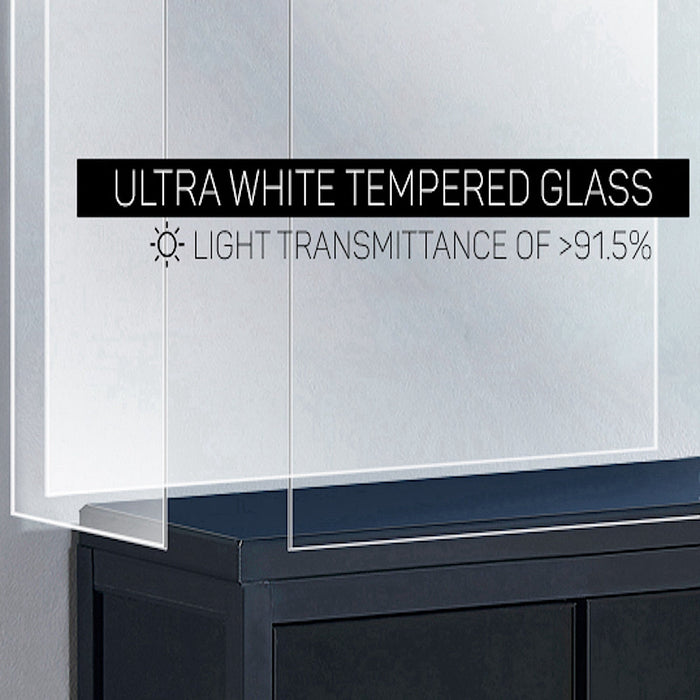 The fish tank is made of high-quality low-iron tempered ultra-white transparent glass ("crystal glass"), with a light transmittance of >91.5% for a clearer-looking tank that is more resistant to scratches and fingerprints. Robust ~0.315 inches thick glass paneling allows the tank to easily withstand the impact of everyday use as well as increase acid and alkali resilience. Each panel is bonded by a German high-endurance biophilic silica gel which can resist saltwater erosion for up to 20 years.