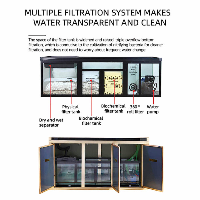 The premium aluminum frame prevents deformation and fading, and also comes with a tri-color LED-equipped cover. The cabinet frame is also resistant to tension and torque deformation which can be caused by heavy loads as well as being corrosion resistant. The cabinet houses the sump filtration system, which will include all pieces needed for installation, as well as a submersible aquatic pump. The sump filtration system includes a wet-dry filtration system as well as designated filter media dividers. This will allow for a modular approach when handling the filter media of your choice.