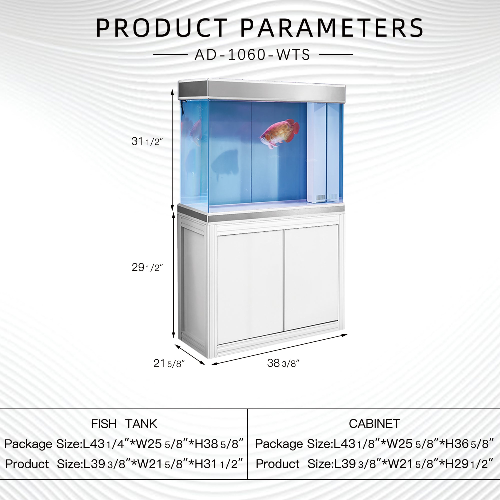 39.4 (L) x 19.7 (W) x 31.5(H) inches for a water capacity of 86 Gallons Tempered Glass with a light transmittance < 91.5% Led Light Cover, with 2 tri-color LED lights and mounting brackets Aluminum frame, resistant to scratches and deformation