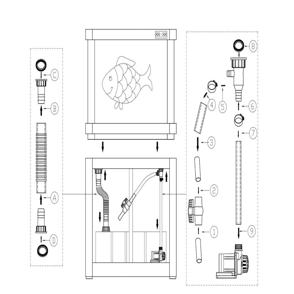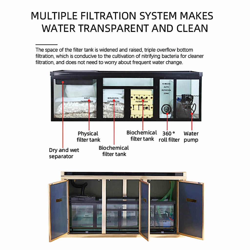 The premium aluminum frame prevents deformation and fading, and also comes with a tri-color LED-equipped cover. The cabinet frame is also resistant to tension and torque deformation which can be caused by heavy loads as well as being corrosion resistant. The cabinet houses the sump filtration system, which will include all pieces needed for installation, as well as a submersible aquatic pump. The sump filtration system includes a wet-dry filtration system as well as designated filter media dividers. This will allow for a modular approach when handling the filter media of your choice