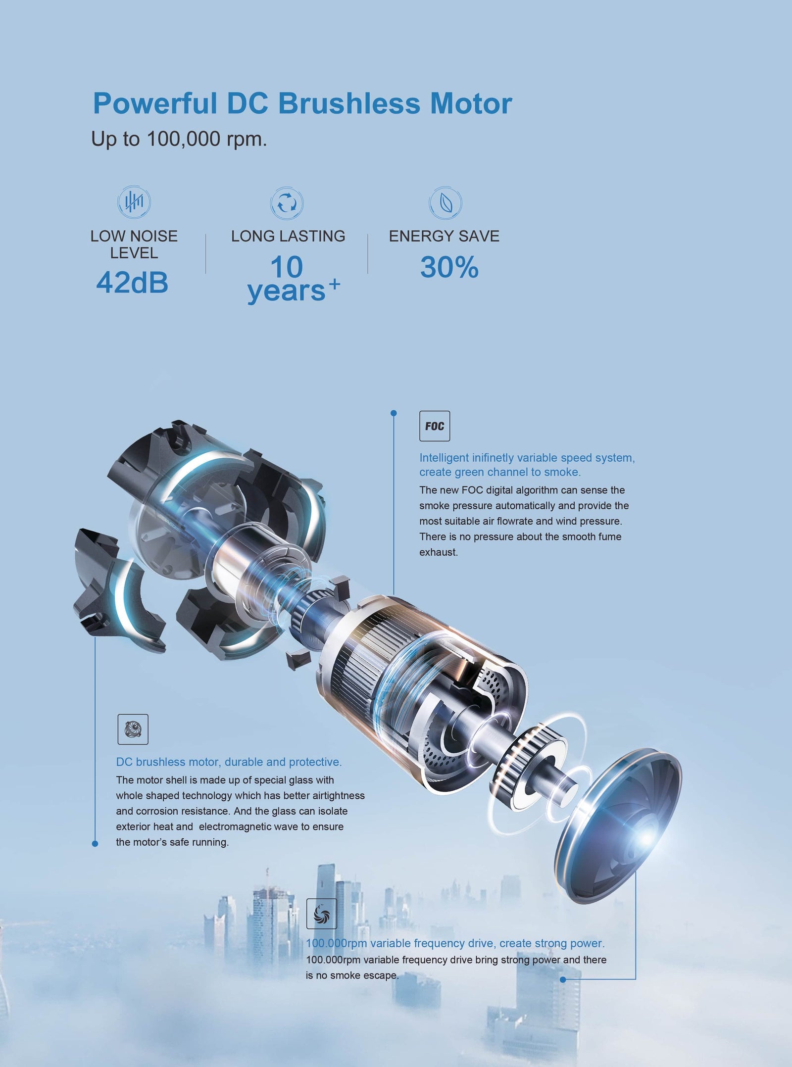 • Powerful single blower that delivers 800PA static pressure remains quiet at 42 dB thanks to acoustic panel wraps