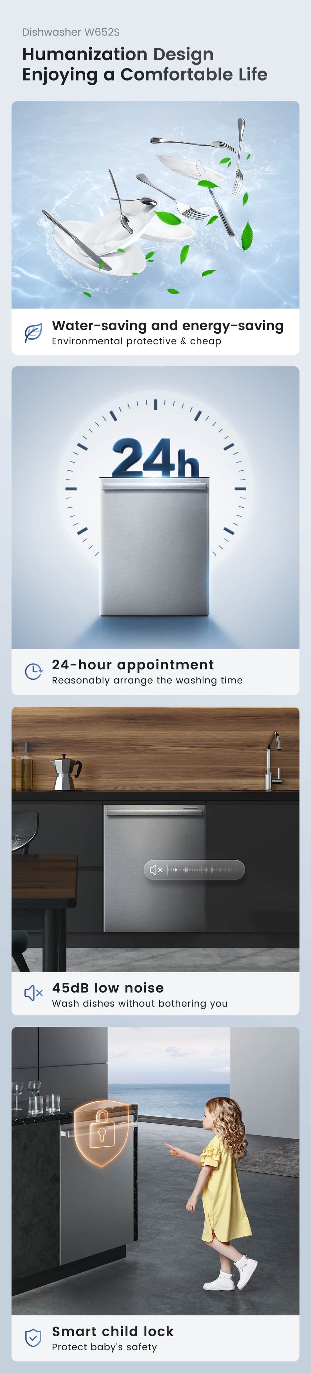 • Reaching just 45dB, this ultra-quiet stainless steel built-in the dishwasher can run almost unnoticed, and its large capacity storage racks can hold 14 place settings