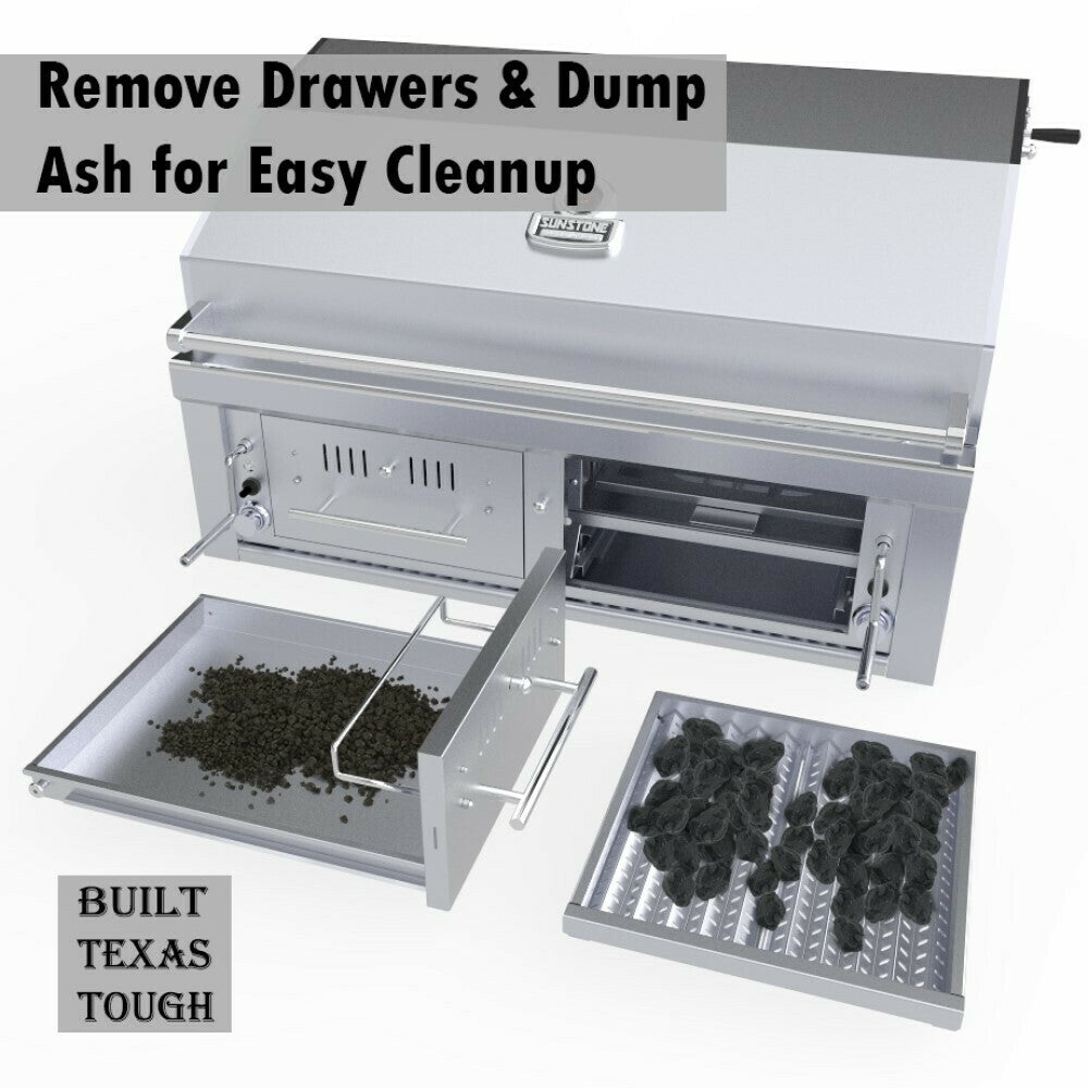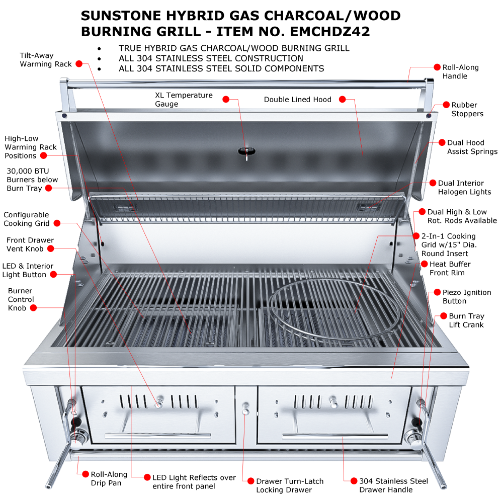 The Sunstone Series 42” Gas/Charcoal/Wood Hybrid offers integrated Dual Gas Burners at 35,000 BTU under each Charcoal/Wood Drawer. Easily replenish Charcoal or Wood type while you continue grilling then remove the whole drawer for easy clean-up, dumping ash waste away. Grill, Smoke or Sear with the height-adjustable top tray which can be loaded with your choice of mesquite, or oak, or charcoal of your choice. Use one side for High Heat Sear Grilling, while the other side is Low Heat Indirect Cooking – and Re-Ignite the Charcoal/Wood in the Burn Trays as Needed. All Construction Materials & Components are made with Solid 304 Stainless Steel – Engineered and Designed in the USA, by the grilling experts of Sunstone