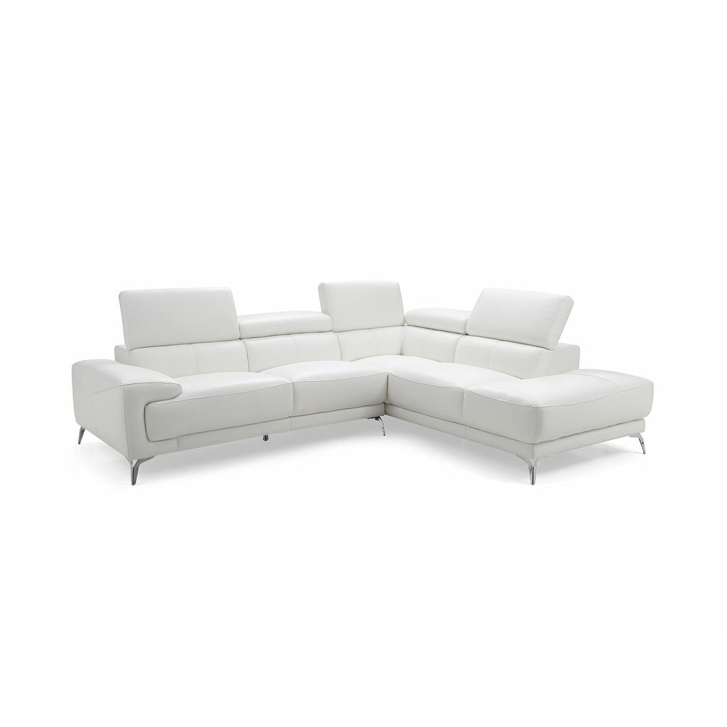 The sleek, contemporary design of this sofa is sure to complement any space. It comes in white with a chaise on the right when facing and light gray with a chaise on the right when facing, white top grain Italian leather, adjustable headrests, and stainless-steel legs make this piece both comfortable and durable.