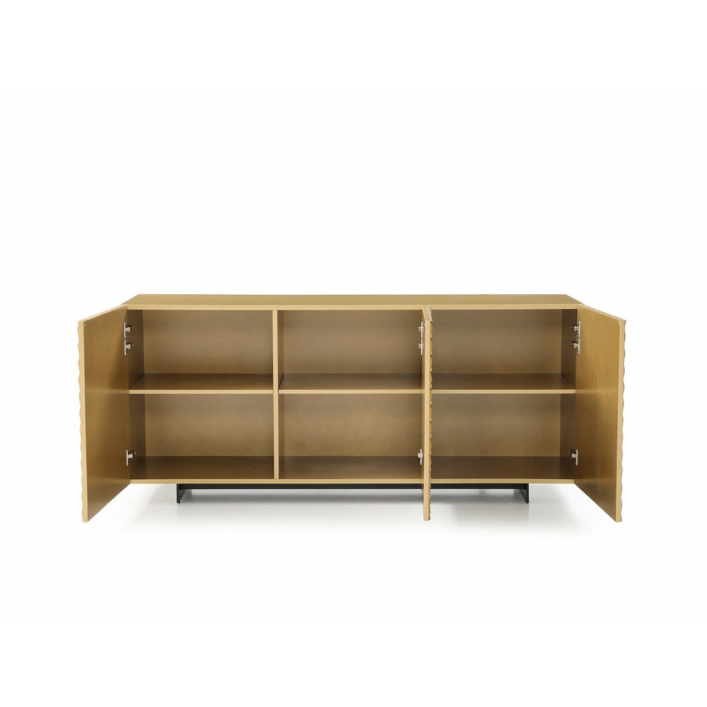 The Harper Buffet shown in High Gloss Gold will add a touch of luxury to your dining space. The wave doors slide seamlessly into place, while the black matte metal legs are clean and modern.