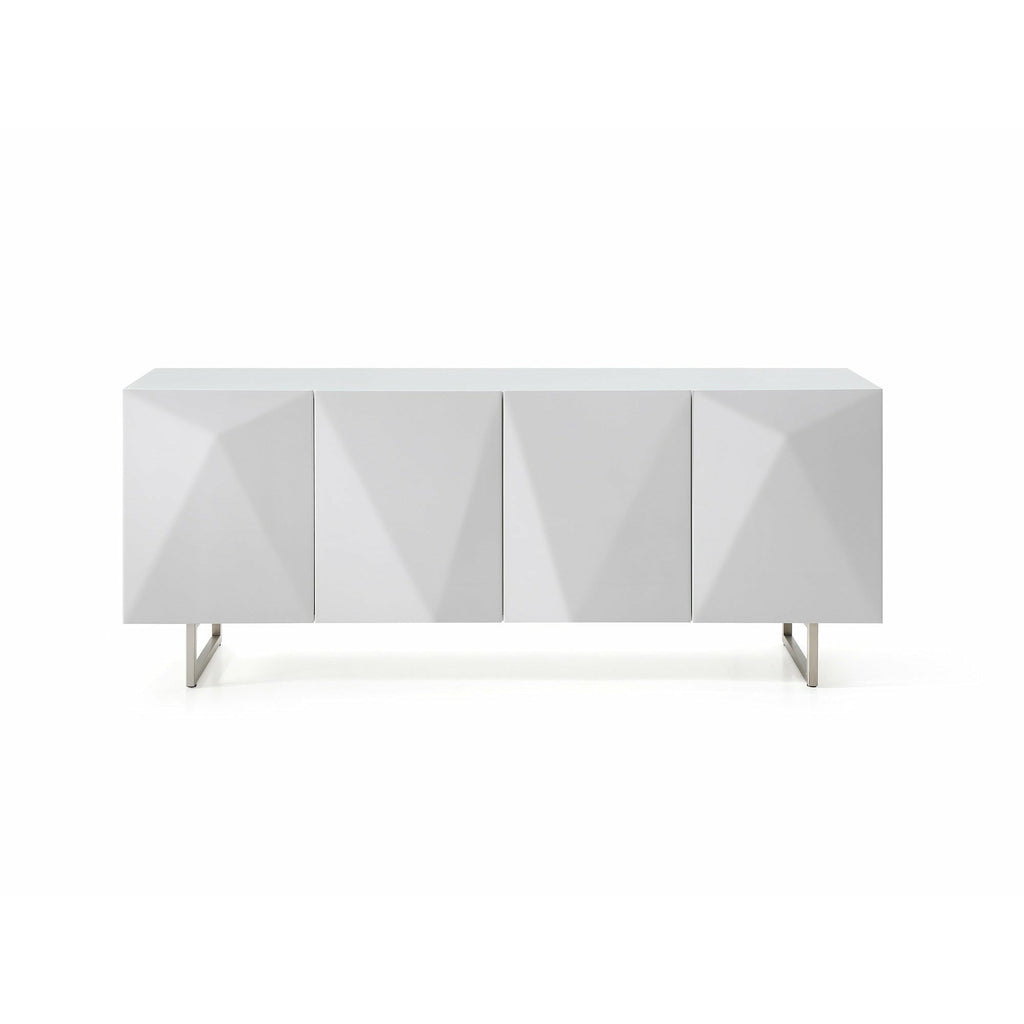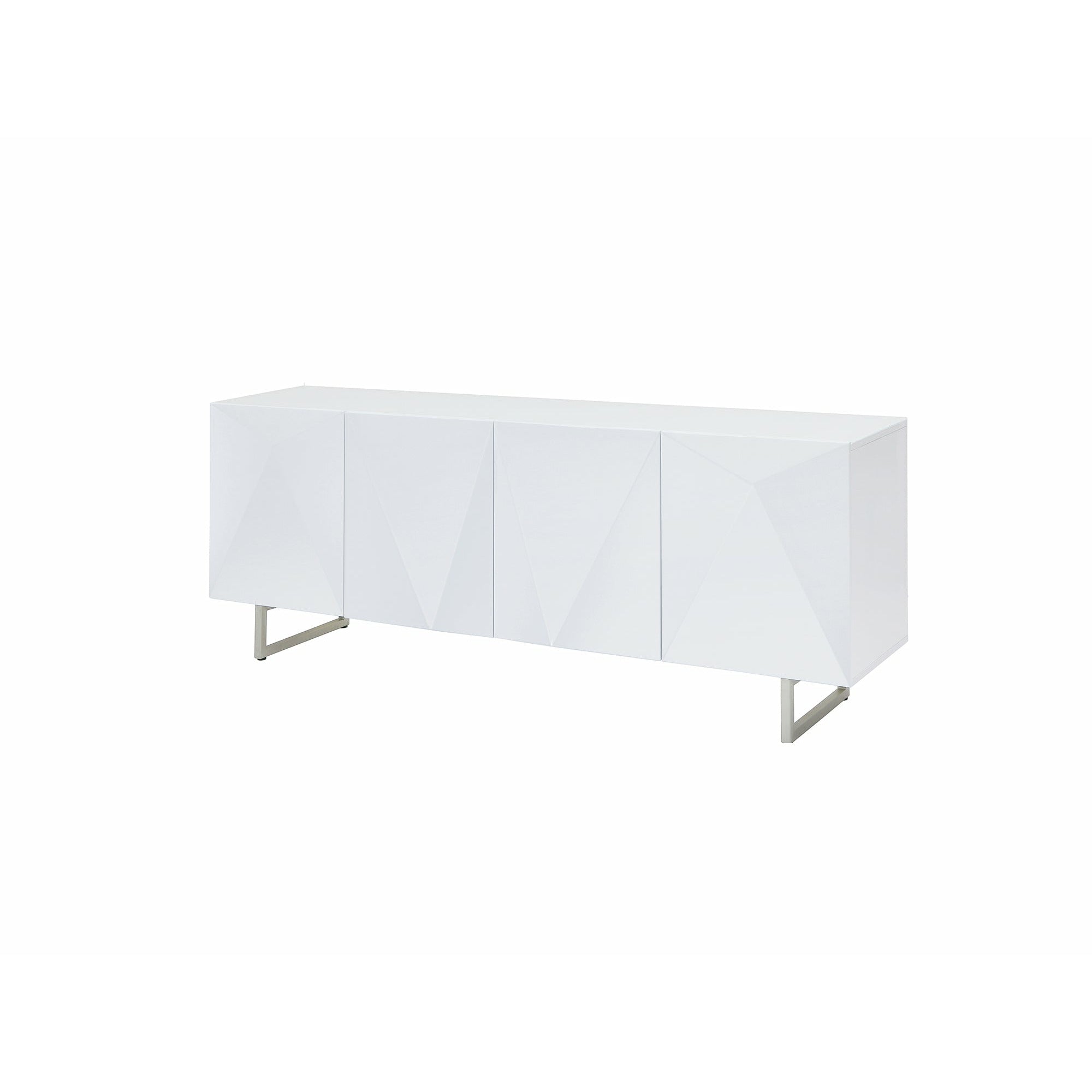 5mm tempered glass top. High Gloss White. Design on doors. Metal legs with brushed nickel finish.