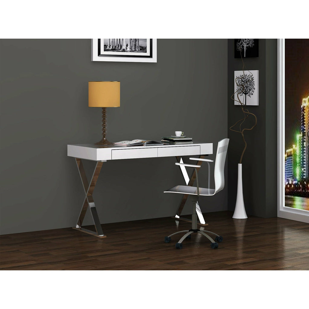 Elm Desk Large, High gloss white, two drawers, Stainless steel base