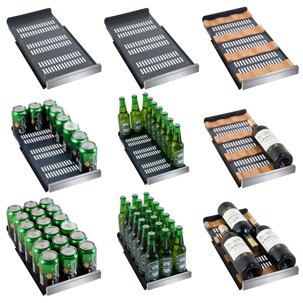 The beverage shelves can hold up to 12 standard 12 oz. cans on the bottom shelf, up to 18 standard 12 oz. cans on each middle shelf, and up to 21 8" tall bottles on the top shelf, for a total capacity of 66 standard 12 oz. cans or 48 standard 12 oz. cans and 21 bottles. They have a textured surface to prevent the contents from sliding.