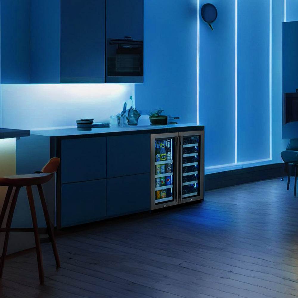 The wine storage side is equipped with wooden slats that refine each shelf to cradle you wine bottles and are designed with vibration-reduction technology to prevent harmful vibrations from excessive movement and damage.