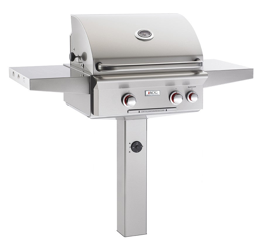 The American Outdoor Grill T-Series - 24-Inch 2-Burner Freestanding Grill On In-Ground Post is a premium and multifunctional outdoor grilling station. It delivers powerful heat output, ideal for everything from grilling and searing to roasting. With a generous 432 square-inch primary cooking surface, it's capable of preparing large amounts of food simultaneously, powered by an impressive 32,000 BTUs. Additionally, it features a 10,000 BTU backburner. Its in-ground post design provides stability while saving space, making it an excellent fit for compact patios or gardens. This grill also comes equipped with a rotisserie system for versatile meal preparations, from juicy steaks to perfect rotisserie chicken. Constructed to last, the AOG24NGT is built to resist weather conditions for years of satisfying outdoor cooking experiences.