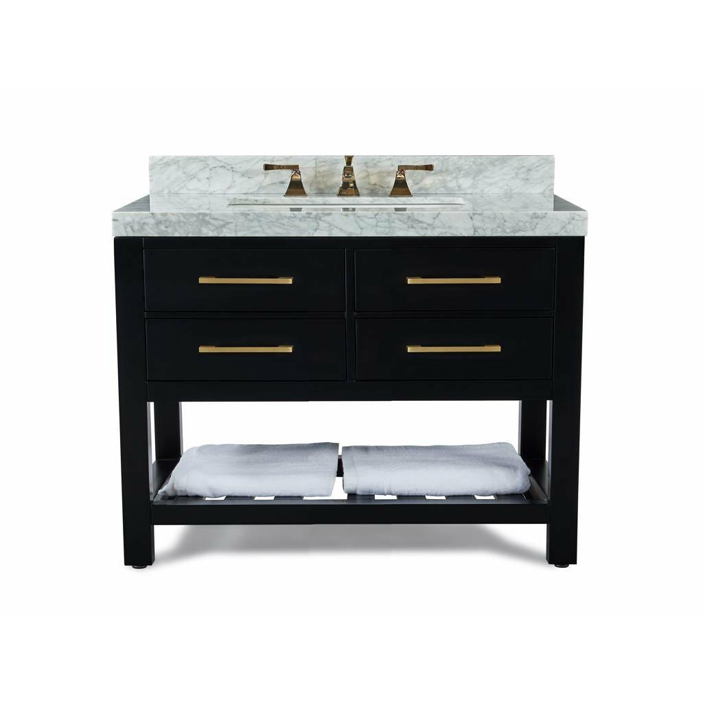 The Elizabeth Collection is a pure transitional design that brings balance and harmony to any space. From selecting quality wood to using the most durable soft-close hardware, no details were overlooked in crafting the Elizabeth single vanity set. The vanity set includes a furniture style cabinet, a thick imported Italian Carrara White marble top with a 4 inch backsplash, wide rectangular under mount basin, solid wood dovetailed drawer boxes, soft-close doors & drawers and brushed gold hardware.