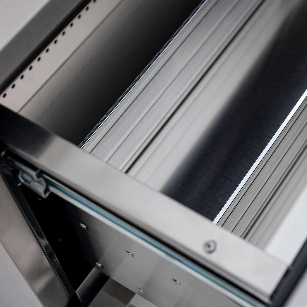 The Blaze Outdoor Rated Double Door Refrigerator is the perfect space-saving addition to any outdoor kitchen. Sleek 304 stainless steel construction gives this refrigerator durability and resistance against the elements, as well as matching the rest of your outdoor kitchen. This refrigerator is ETL approved for outdoor use in temperatures up to 109 degrees F, ensuring that when you want to entertain in those hot summer months, your food and beverages will stay safe and cold. The drawers feature soft-close hardware, as well as adjustable and removable dividers for customizing your storage. These gliding drawers together have space for up to 154 cans. A digital thermostat and temperature display is concealed within the top drawer. The interior is lit by LED lighting, perfect for nighttime entertaining. A trim kit is available separately, granting seamless built-in installation into your outdoor kitchen setup.