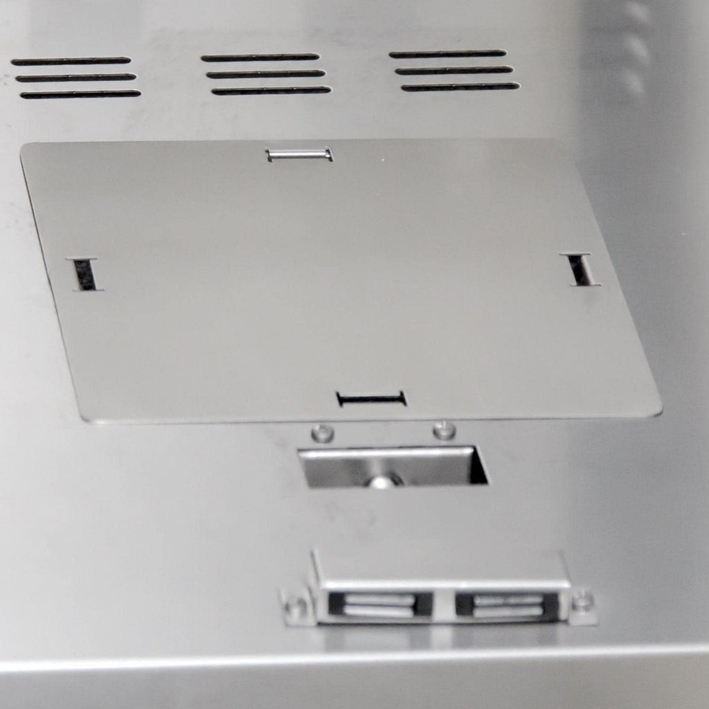 The Blaze LP Hole cover provides a sold surface that can be used for storage in the grill cart. It is designed to cover the propane tank opening in the bottom of the grill cart, which allows for more storage area for grilling accessories. The cover is made from commercial grade 304 stainless steel for lasting durability. It works with any Blaze Original or Professional LUX grill on cart.