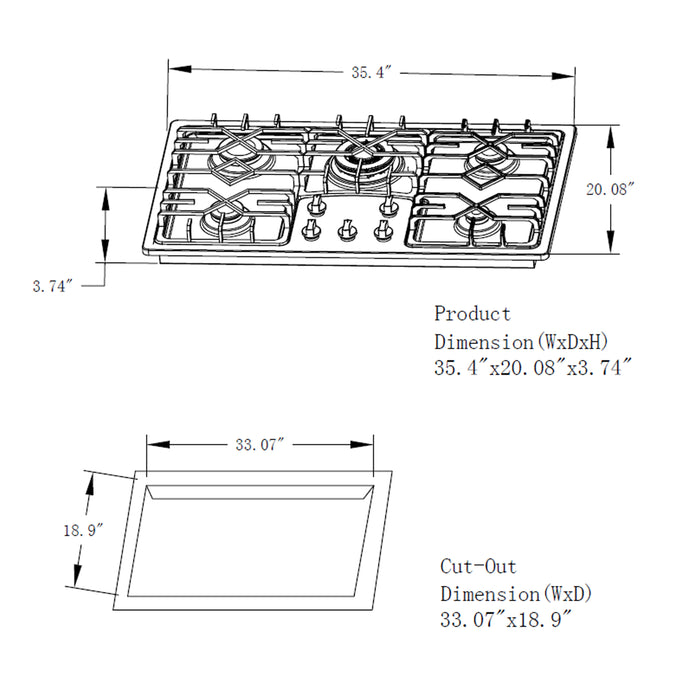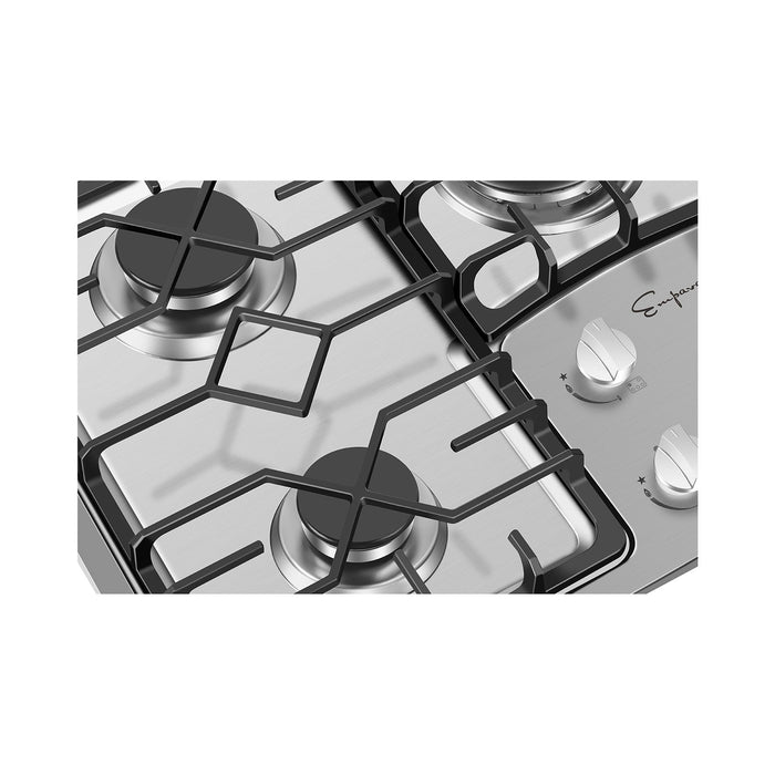 Empava recessed gas cooktop offers 4 versatile burners of different sizes, with a dual ring 5.2" 12000-BTU burner, a 3.74" 10200-BTU burner, two 2.56" 6000-BTU burners, and a 1.77" 3400-BTU burner, which distribute even heat for simmer, boil, stir-frying, steaming, melting or even caramelizing!
