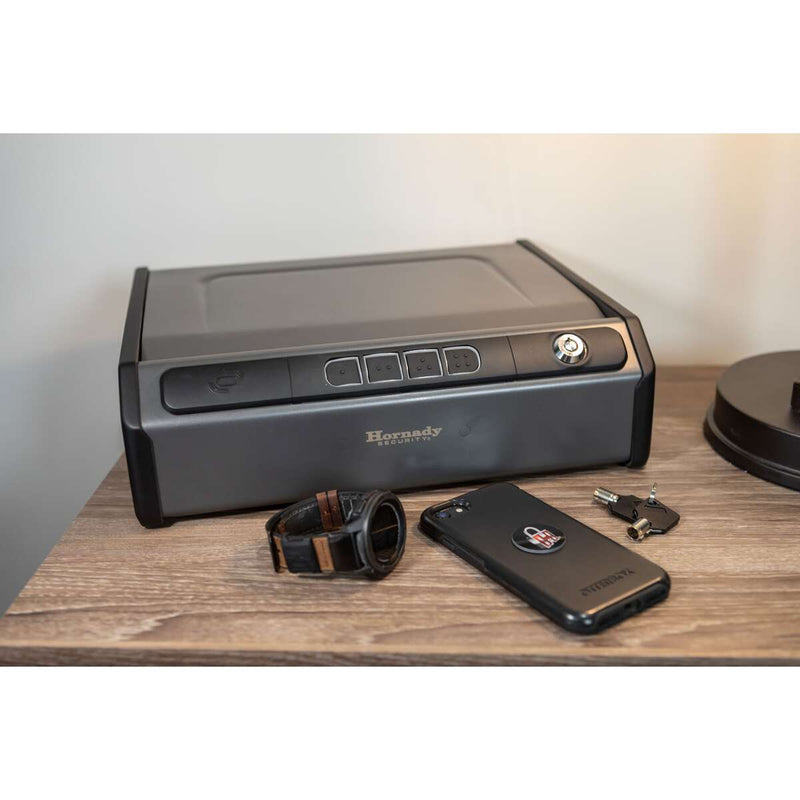 The Hornady Rapid Safe Keypad Vault RFID 97436 is perfect for a bedside table, counter, shelf, or inside drawer. It has pre-drilled mounting holes for permanent mounting to a solid surface. It comprises a heavy-duty 14 gauge steel housing and a thick steel lid for tamper-proof security.