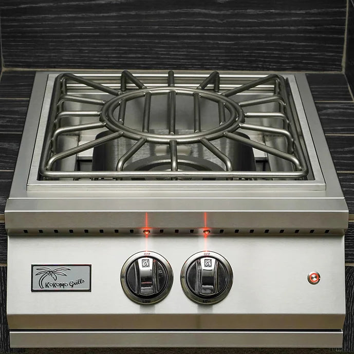 Conventional, Stainless, Propane/Natural Gas, Built-In. The stainless steel cover protects the burner when not in use and features a curved handle to match other Kokomo products. Ignition is made easy with push and turn knobs that offer a reliable flame with every start “Sure Light System” and the full-width drip tray makes clean up a breeze. If you are looking to create a gourmet outdoor meal complete with soups or side dishes, a power burner is an ideal addition to your outdoor kitchen.