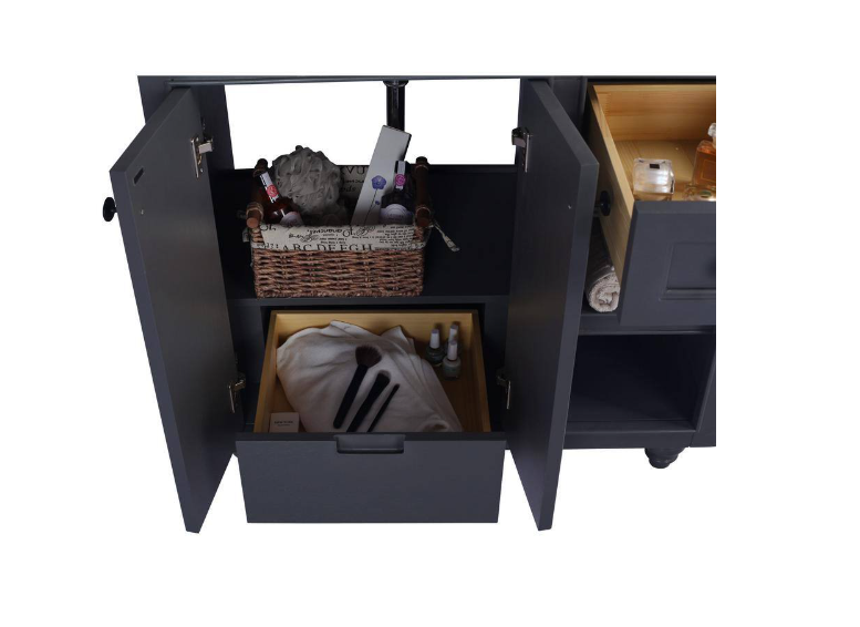 The Odyssey collection is a "work of art" fashioned into a vanity of worth, function, and style. From the top of the countertop, finished so eloquently by the double Ogee edge, to the grain within the finish, lavishly covering the cabinet in 2 colors: Classic White and Maple Grey. The brilliance of the well-thought-out concept continues with open shelves and top drawer (on the 36 in. or larger). This vanity also comes with an optional Toe-Kick assembly to cover the freestanding legs for a "built-in" approach. Available in single sink options in 30 in., 30 in., 36 in., 48 in., and double sink option in 60 in.