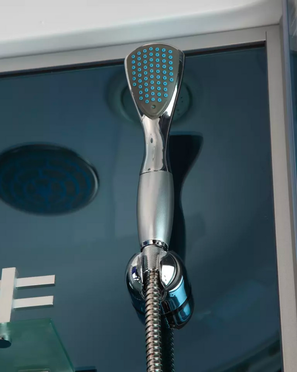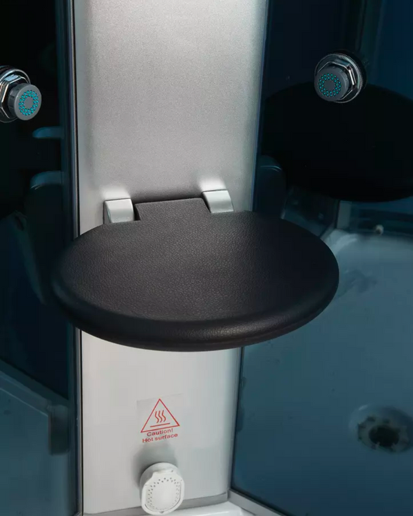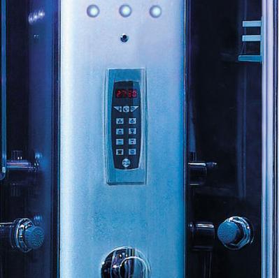 The Mesa 9090K corner steam shower features tinted blue glass and a nickel interior control panel. The 9090K is the perfect one-person steam shower for any corner or free-standing application. A favorite of both commercial and residential customers, it features sliding glass doors, chrome trim, and a fold-up seat for additional space. The sleek design and curved tinted blue glass are both stylish and appealing.