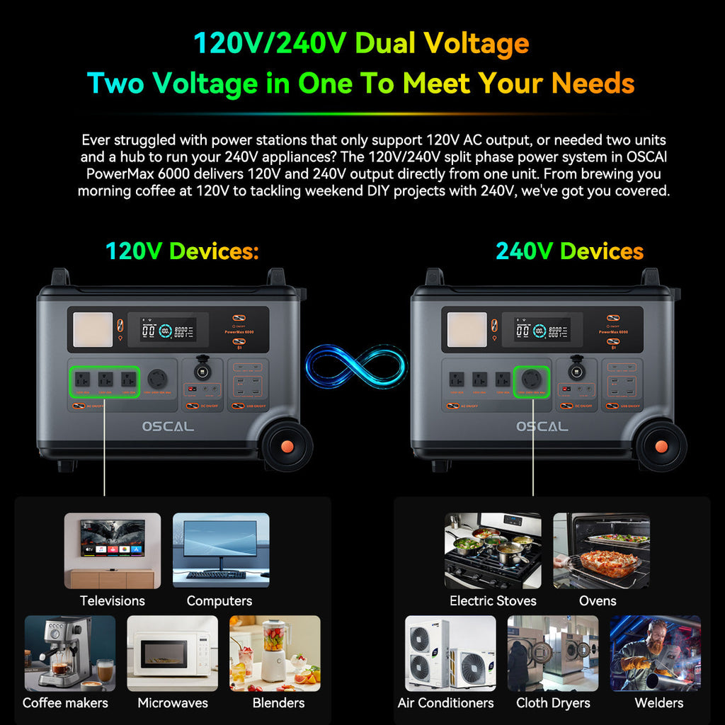 The Oscal PowerMax 6000 is a powerful and reliable energy solution for home backup, off-grid power, RV trips, construction sites, and emergency situations. With dual-voltage output, smart controls, and ultra-fast charging, it provides unmatched flexibility and convenience for any power need.