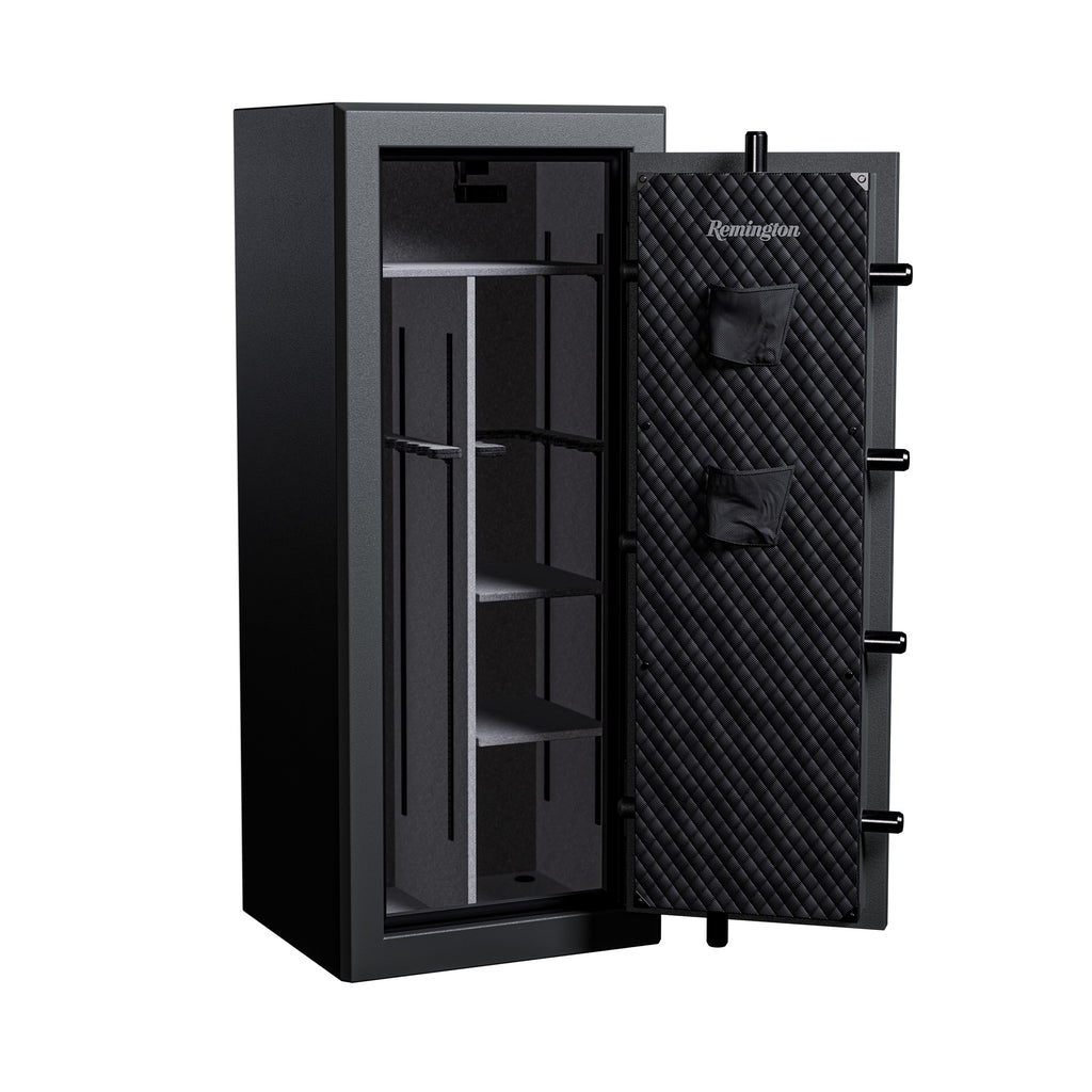 Consistent, secure, and feature-filled the Remington Gun Club 20 + 2-Gun Fireproof and Waterproof Gun Safe offers best-in-class protection and quality. Independently tested, this fireproof and waterproof gun safe has Triple Seal protection against fire, water, and smoke damage to protect your hard-earned collection from disaster. The programmable SecuRam UL Rated electronic lock offers a high degree of security with EMP-attack resistance and 2 Fail Safe override keys to ensure access is possible in any situation. Interior features include full carpeting, carpeted barrel rests, a quilted door organizer with handgun holsters, and a UL Rated dual power outlet with 2 USB ports.