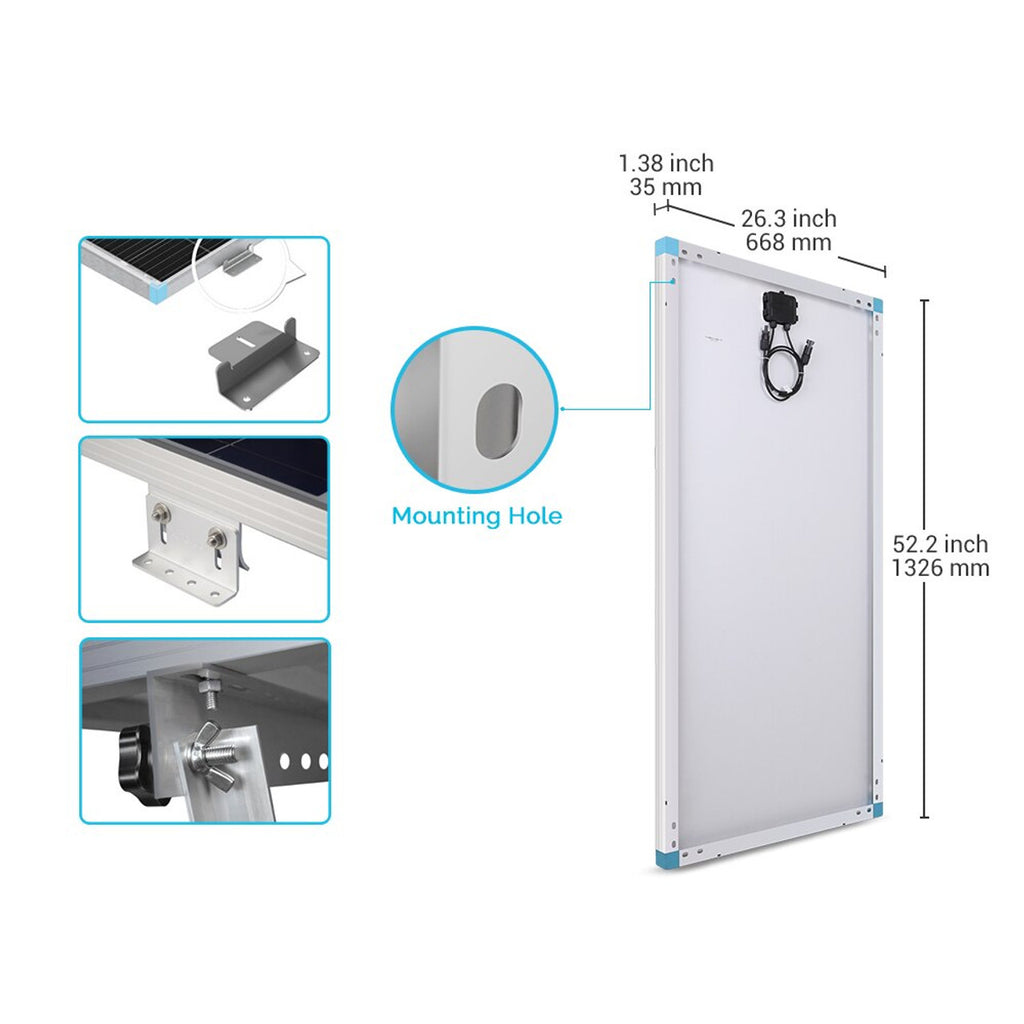 - Compatible with a variety of Renogy mounting systems such as Z-Brackets, Pole Mounts and Tilt Mounts