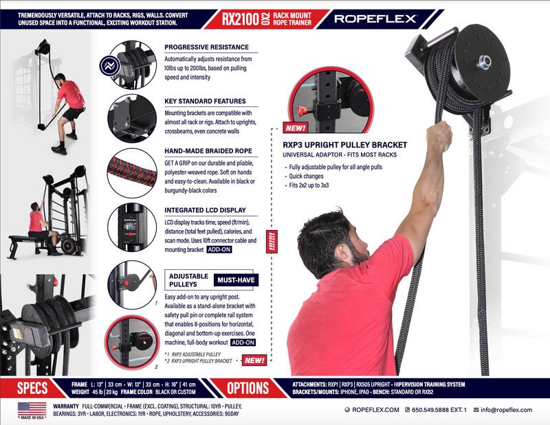 Best of all, the same benefits and safety features of functional exercise and sport-specific training that other ROPEFLEX™ models provide can be yours without losing any floor space, by simply attaching the RX2100 to your existing hardware.