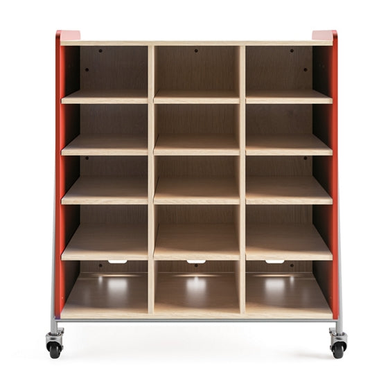 The Whiffle Rolling Storage Cart provides robust, easy-to-move storage for your classroom, office, or craft space. The cart features 15 open shelves, separated into 3 columns. Each column has 5 shelves with plenty of space to store classroom supplies.