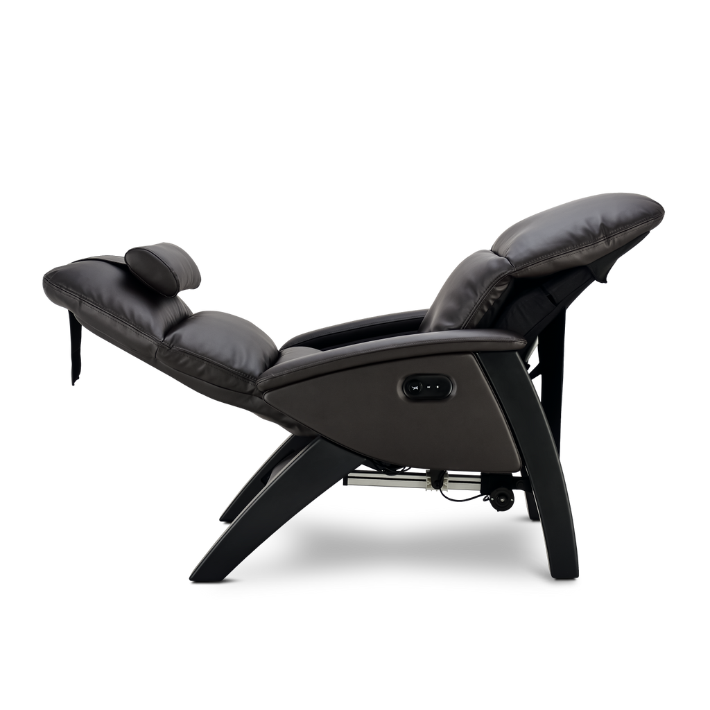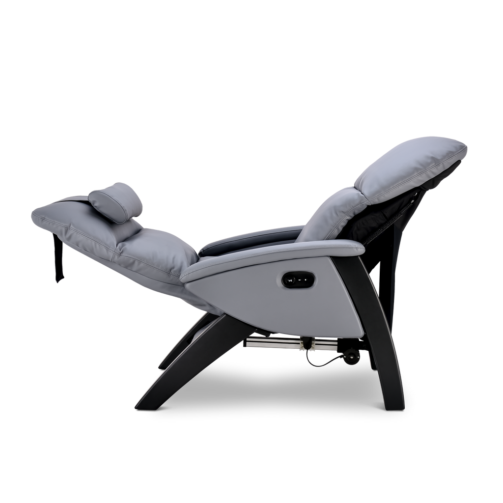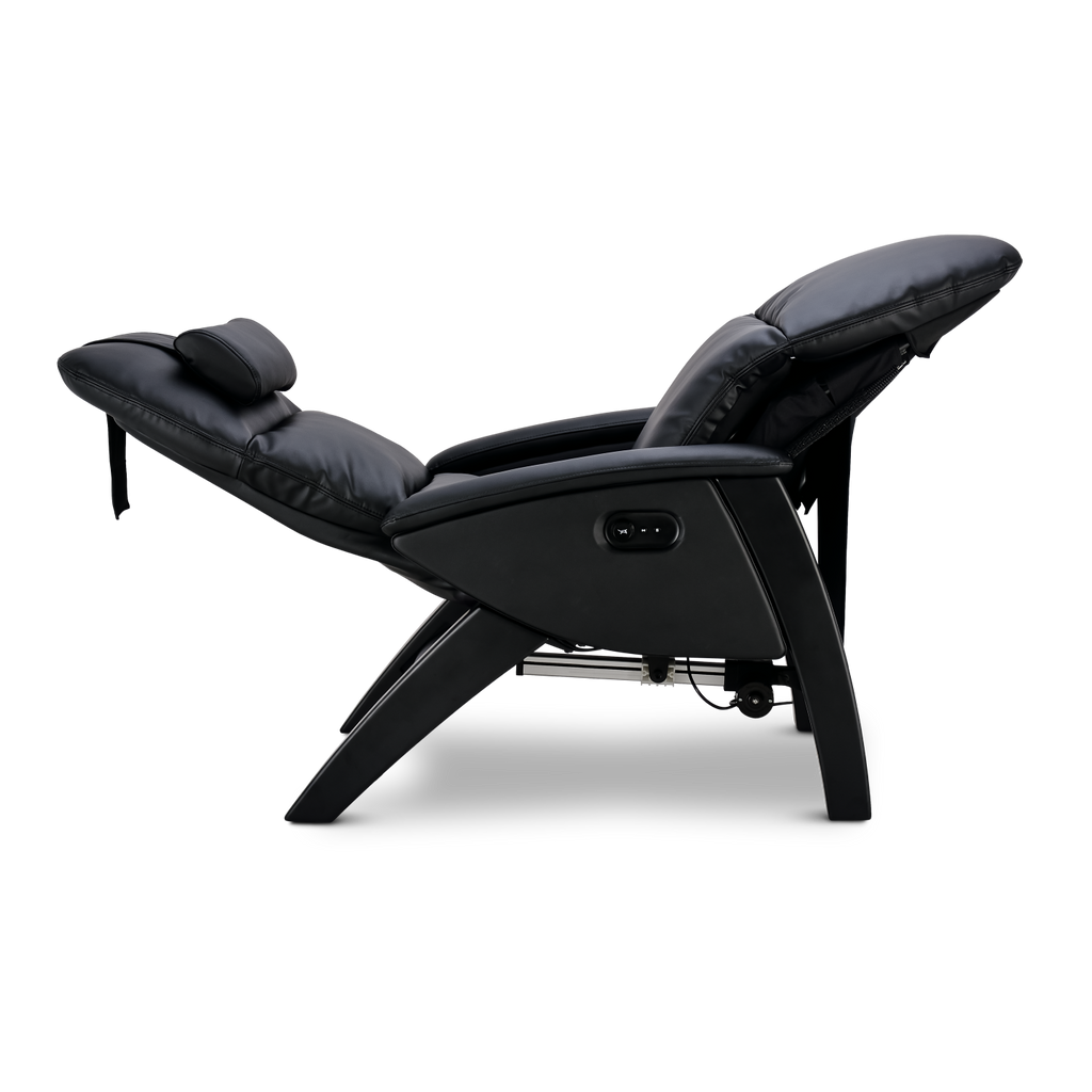 Our entry-level zero gravity recliner chair has all of the benefits of zero gravity, with synthetic hyde, hand-carved wood base, lumbar vibration massage and heat, relaxation, self-care, quicker recovery, and back health are here.